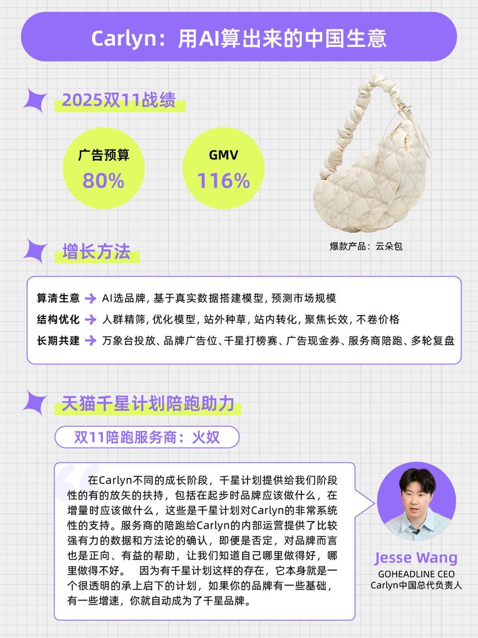 在 GOHEADLINE 的数字化赋能下,Carlyn 实现销售与品牌声量双重突破:2025 年 618 大促期间销量同比增长 400%,在箱包类目整体下滑态势下逆势登顶类目销量第一;2025 年双 11 以更优的投入产出比实现 GMV 大幅增长,中国市场一跃成为 Carlyn 全球第三大、增速最快的市场。与此同时,Carlyn 凭借出色的成长表现与品牌潜力,接连斩获2025 年度天猫千星奖2026 年度天猫新锐品牌奖,成为天猫平台重点培育的标杆级海外新锐品牌,这一系列荣誉既是对 Carlyn 品牌实力的认可,更是对 GOHEADLINE 数字化管理能力与科技服务水平的权威肯定。