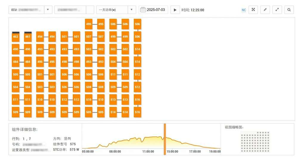如下图所示,通过昱能科技EMA智能运维平台,我们以7月3日为例,可以看到当天下午15时左右,位于屋顶西北角的多块组件受阴影遮挡,其发电功率受到了不同程度的影响,而得益于微型逆变器组件级MPPT的优势,被遮挡组件并不会影响到其他正常组件的运行,这大大降低了组件失配的影响,减少了发电量的损失。